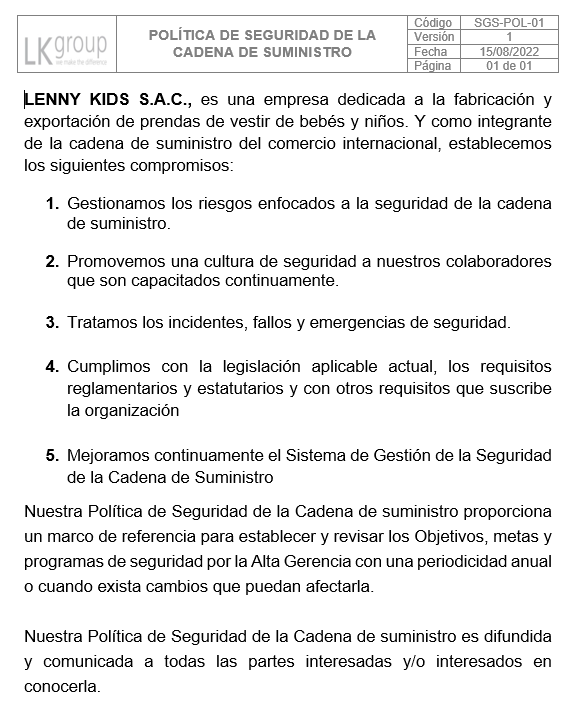 Quality is the most important thing for LK Group Family. We are all part of a strong commitment for our custumers regarding details in each process starting from the tread and finishing on our packaging. We are proud to have a ISO Cerification, BASC Certification and CTPAT Certification.